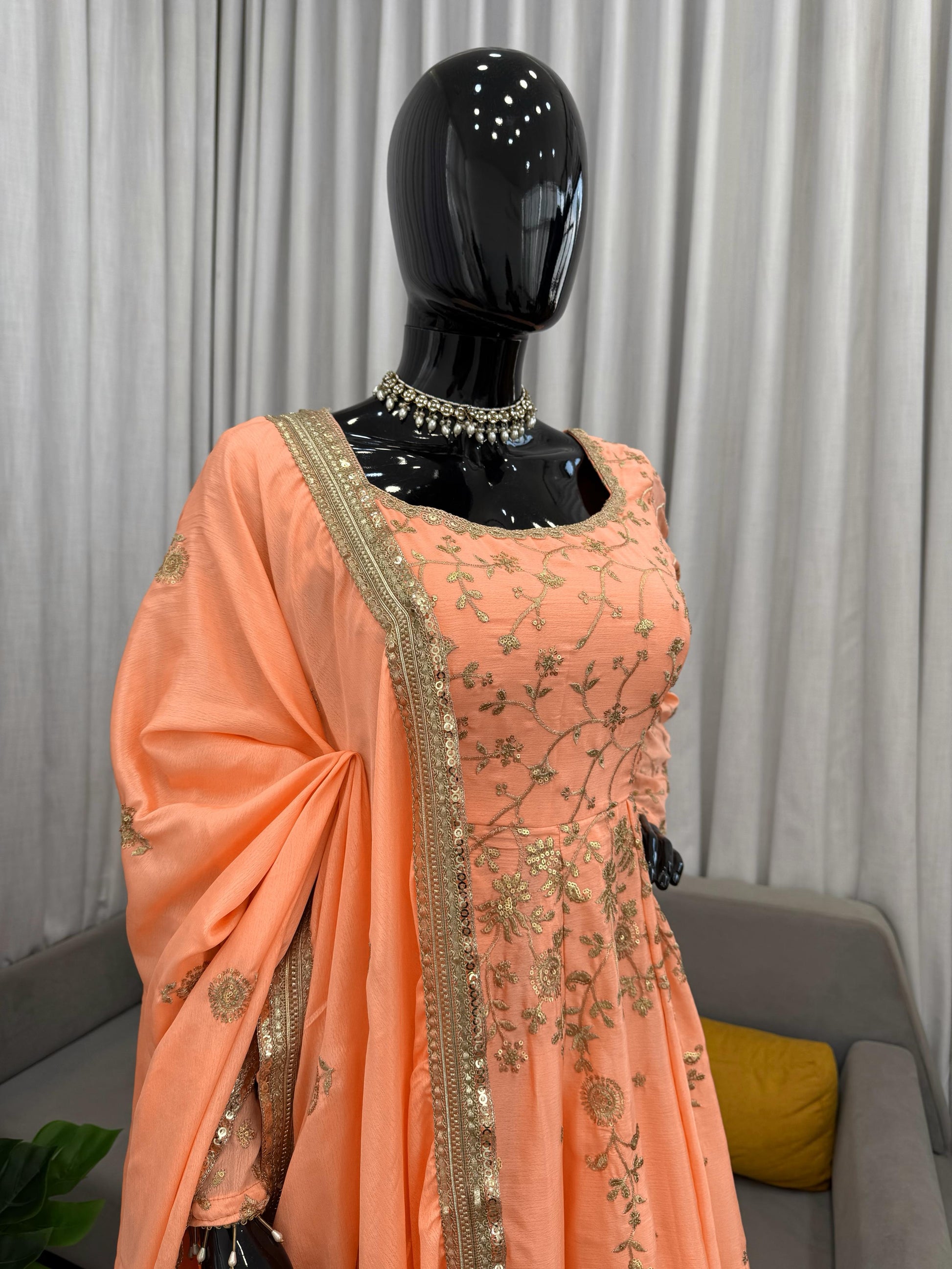 Step into effortless elegance with this beautifully crafted gown and lehenga set, designed for women who love refined ethnic glamour. Made in luxurious heavy Chinon silk with intricate detailing, this ensemble blends modern sophistication with timeless tradition.