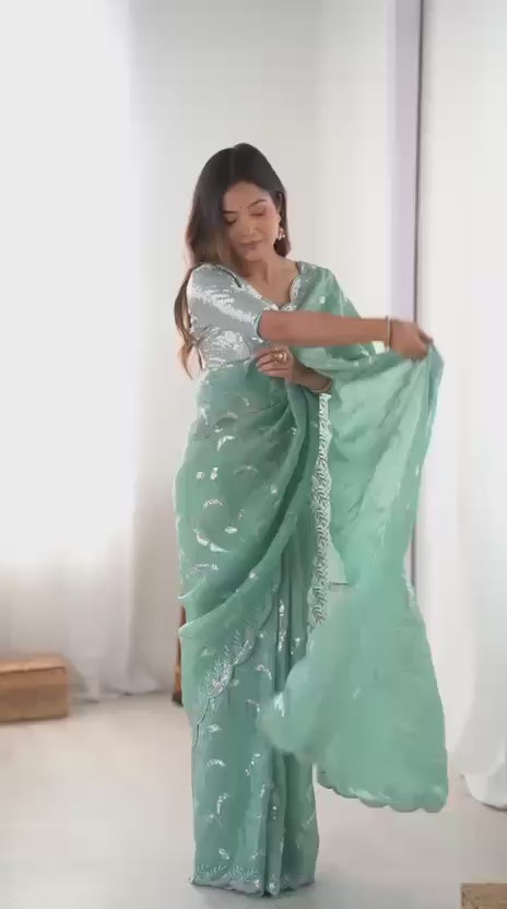 Launching our new series featuring real model imagery, designed to highlight elegance, texture, and modern festive styling. This saree set is crafted for women who love lightweight shimmer with statement embroidery.