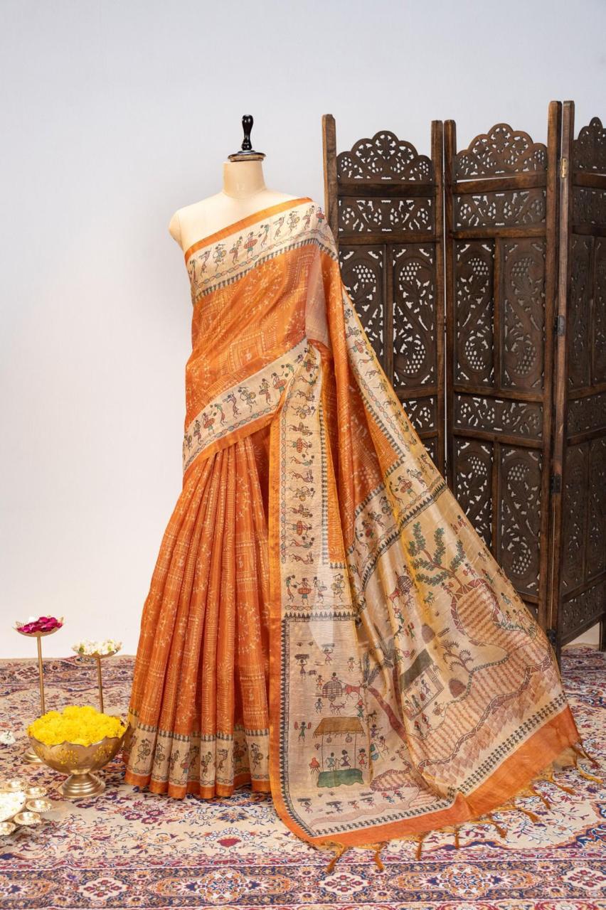 Introducing our premium soft Pure Tissue Tussar silk saree, beautifully designed with traditional Warli prints for a timeless ethnic appeal. Featuring a stunning Warli printed pallu and all-over traditional motifs, this saree blends heritage artistry with modern elegance.